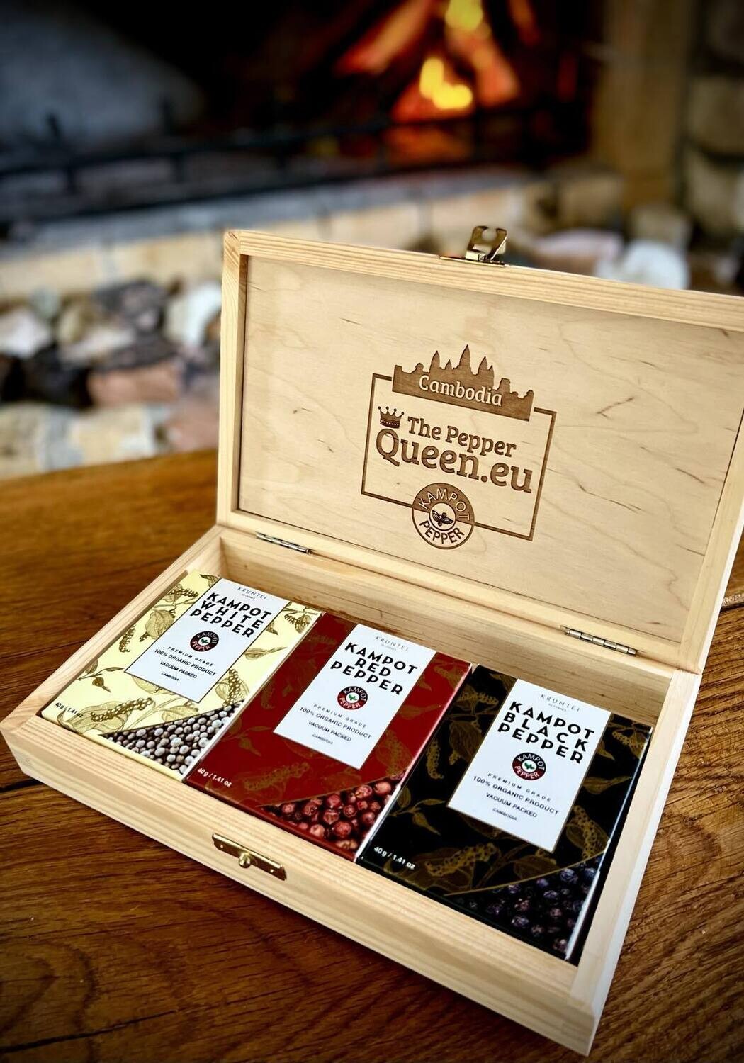 A gift set of Kampot pepper in a wooden box